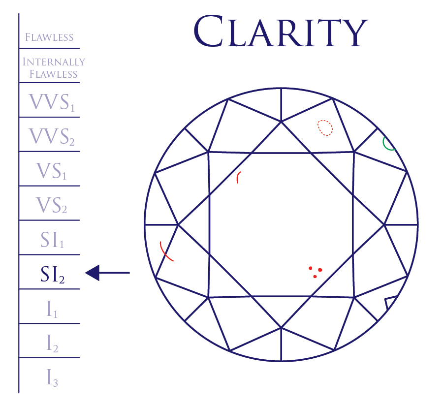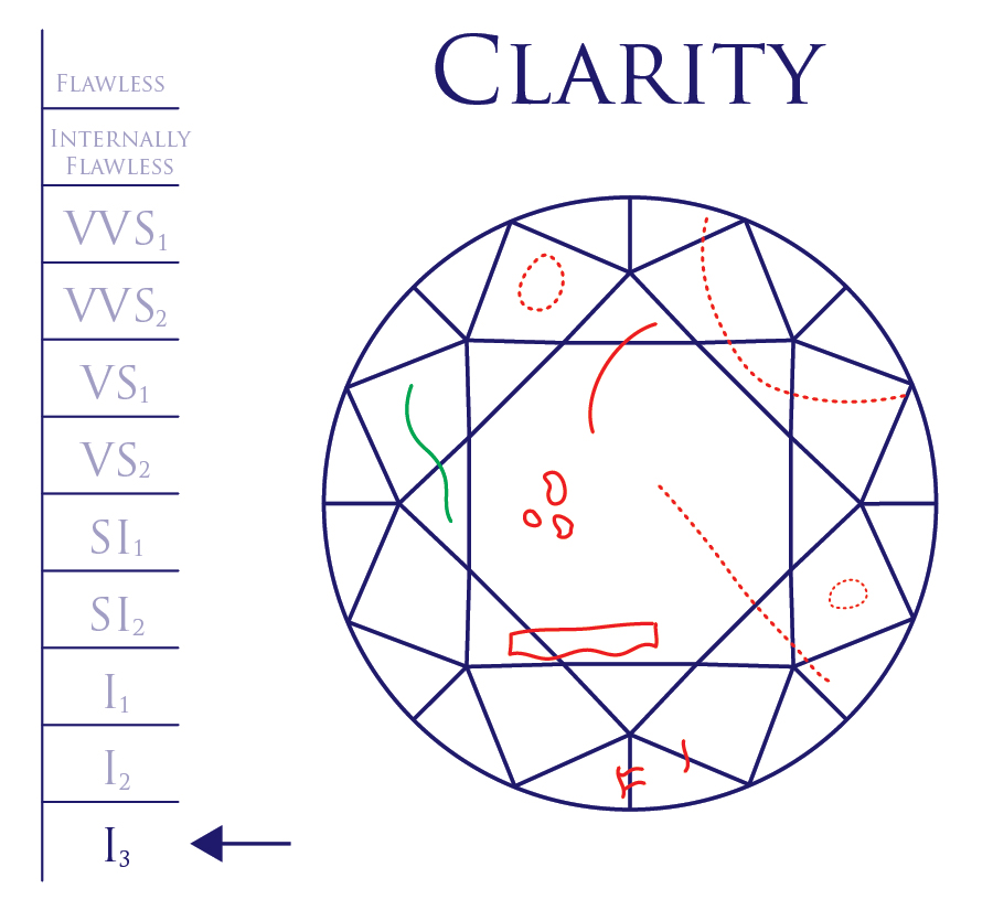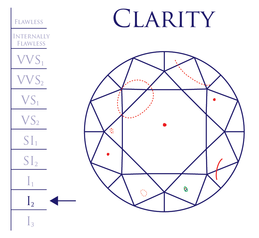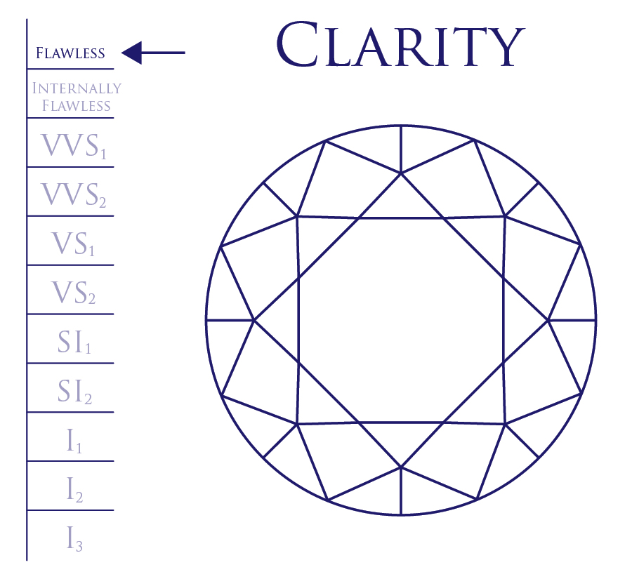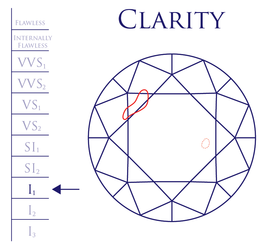 Diamond clarity refers to the absence or existence of visible flaws. Because diamonds are formed deep within the earth, under extreme heat and pressure, they often contain unique birthmarks, either internal (inclusions) or external (blemishes). Each of these flaws, including those that can only be seen under magnification, affects the brilliance of a diamond, therefore effecting its value. Diamonds are assigned a clarity grade, ranging from Flawless (FL) to diamonds with obvious inclusions (I3).