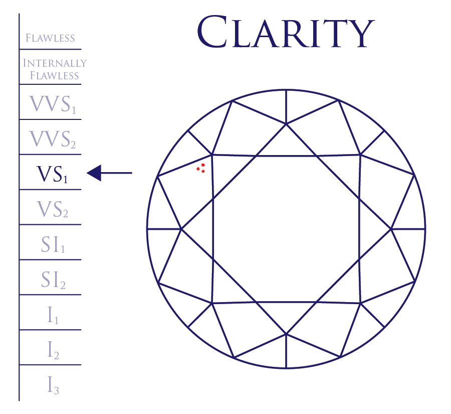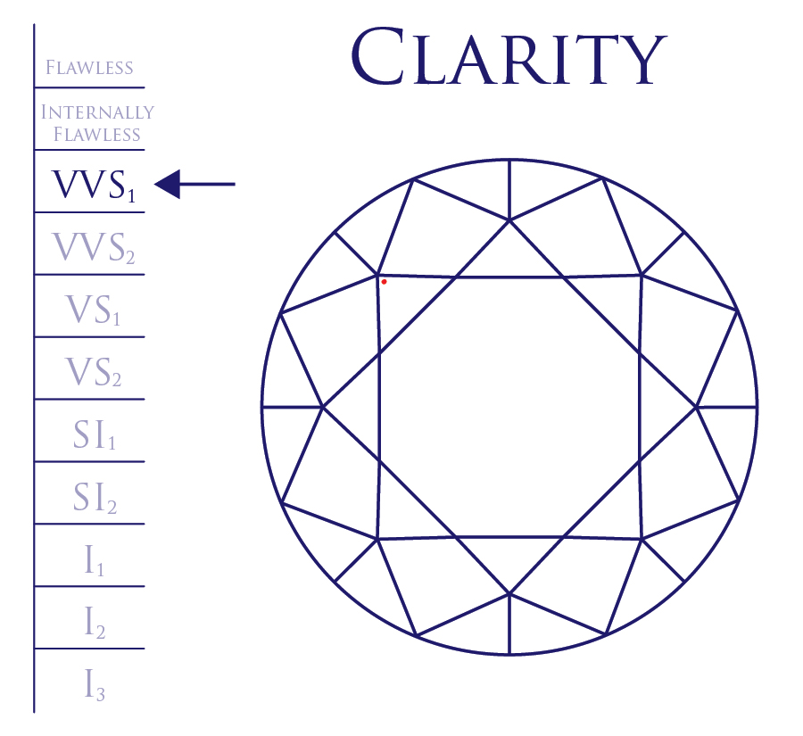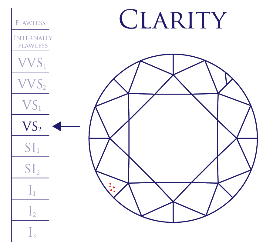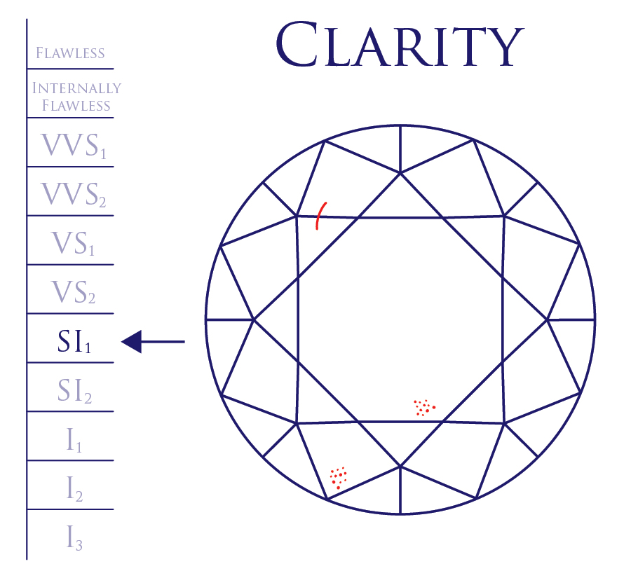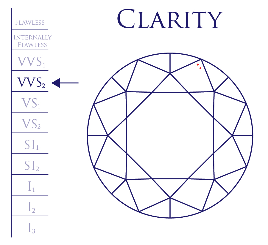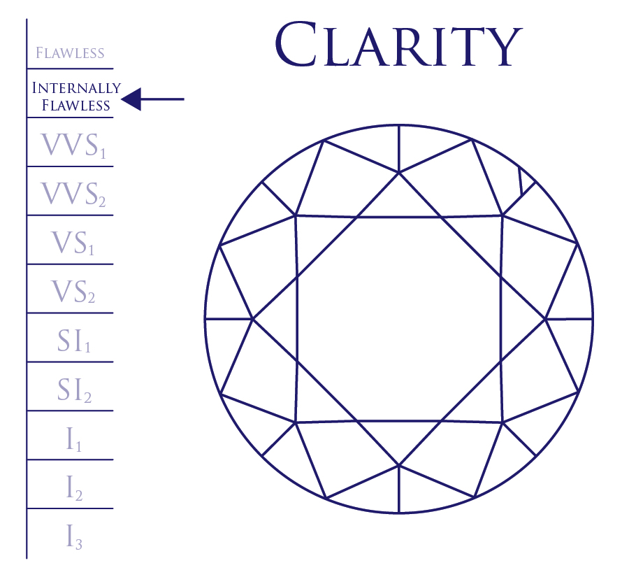 Diamond clarity refers to the absence or existence of visible flaws. Because diamonds are formed deep within the earth, under extreme heat and pressure, they often contain unique birthmarks, either internal (inclusions) or external (blemishes). Each of these flaws, including those that can only be seen under magnification, affects the brilliance of a diamond, therefore effecting its value. Diamonds are assigned a clarity grade, ranging from Flawless (FL) to diamonds with obvious inclusions (I3).