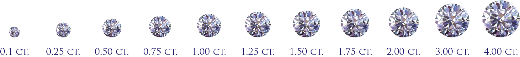 While gold and platinum are weighed in grams, diamonds are weighed in carats. One carat equals 200 milligrams in weight. Contrary to popular belief, carat weight does not refer to the actual diameter of the stone. Two diamonds of the same carat weight could look like two very different size stones if one is a much deeper cut than the other. This is why it is important to consider all aspects of the diamond when selecting a stone.